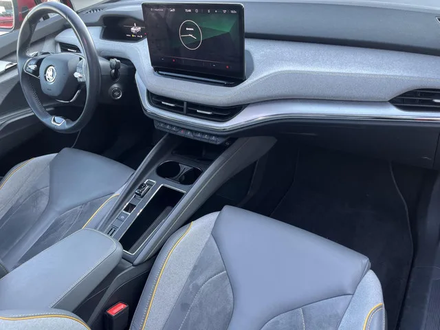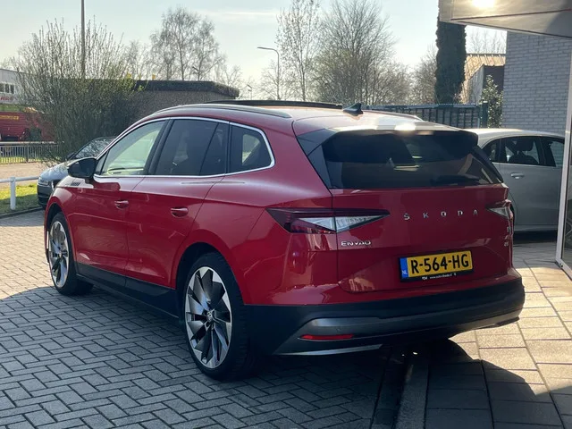 Skoda Enyaq iV 80 KWh 204PK Voorzien van oa: Pano, el. trekhaak, 21inch, keyless, LED Matrix, adaptieve cruise enz SOH 90%. Skoda Enyaq iV 80 KWh 204PK PANO+ACC+TREKH+KEYLESS+MATRIX. Kenteken: R-564-HG; Merk: Skoda; Model: Enyaq iV; APK tot: 03-12-2027; Tellerstand: 114726 KM; Carrosserievorm: SUV; Aantal deuren: 5; Brandstofsoort: Elektrisch; Accucapaciteit: 80 kWh; Actieradius: 502 km; Accuconditie: 90 %; Aantal laadfasen: 3-fasen; Geschikt voor snelladen: Ja; Bouwjaar: 2021; Transmissie: Automaat; Kleur: rood; Kleurnaam: Velvet Red metallic; Bekleding: Leder/Stof; Kleur interieur: antraciet; Interieurnaam: D. Grey; Motorcode: EBJ; Vermogen: 150 kW / 204pk; Ledig gewicht: 1990 kg; Max. trekgewicht: 1000 kg; Aantal zitplaatsen: 5; BTW/Marge: Marge, de BTW is niet aftrekbaar; Lengte: 465 cm; Breedte: 188 cm; Hoogte: 1616 cm; Aantal sleutels: 2; Onderhoudshistorie aanwezig: ; Motorrijtuigenbelasting: € 270 - 296 per kwartaal; Emissieklasse: Euro Z. Comfort. Cruise control...