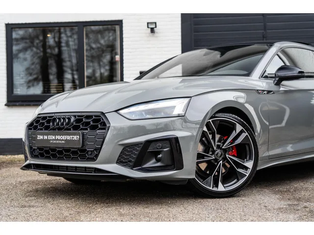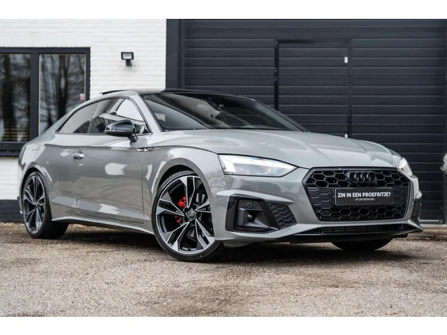 Supper nette Audi A5 Coupe 40 TFSI 20 INCH| LEER| CAMERA| STOELVERWARMING| MATRIX LED| QUANTUM GRIJS. Audi A5 Coupé 40 TFSI Pro S-Line Pano B&O 20" quantum grey. Kenteken: T-929-FV; Merk: Audi; Model: A5 Coupé; APK tot: 16-03-2028; Tellerstand: 111369 KM; Carrosserievorm: Coupé; Aantal deuren: 2; Brandstofsoort: Benzine; Bouwjaar: 2020; Transmissie: Automaat; Kleur: grijs; Kleurnaam: quantum grey; Bekleding: Leder/Alcantara; Kleur interieur: zwart; Interieurnaam: S-Line; Motorinhoud: 1984 cc; Aantal cilinders: 4; Motorcode: DLV; Vermogen: 140 kW / 191pk; Ledig gewicht: 1430 kg; Max. trekgewicht: 1500 kg; Aantal zitplaatsen: 4; Verbruik: 5.9 l/100 km; BTW/Marge: Marge, de BTW is niet aftrekbaar; Breedte: 185 cm; Aantal sleutels: 2; Onderhoudshistorie aanwezig: Ja; Motorrijtuigenbelasting: € 226 - 247 per kwartaal; Emissieklasse: Euro 6. Pakket: Assistentie pakket Parking. Achteruitrijcamera; Hill hold functie; Parkeer assistent; Parkeersensor voor. Pakket: Assitentie pakket Rijden. ...