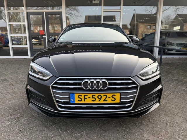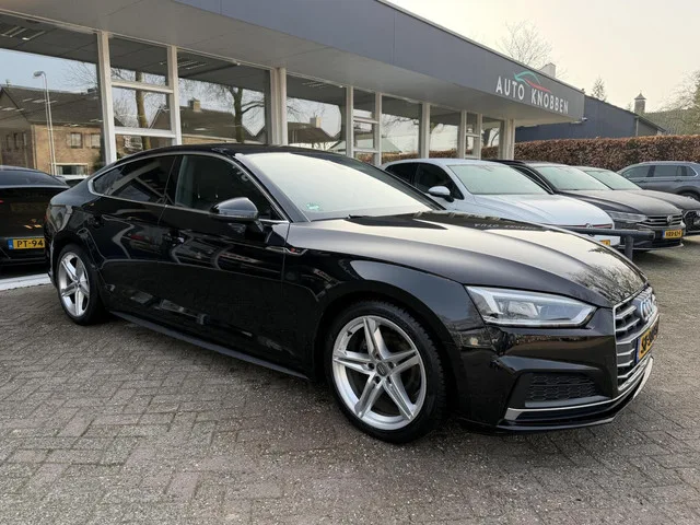 Audi A5 Sportback 2.0 TFSI MHEV Sport S-line Edition. Kenteken: SF-592-S; Merk: Audi; Model: A5 Sportback; APK tot: 26-03-2027; Tellerstand: 169662 KM; Carrosserievorm: Hatchback; Aantal deuren: 5; Brandstofsoort: Benzine; Bouwjaar: 2018; Transmissie: Automaat; Kleur: zwart Metallic; Motorinhoud: 1984 cc; Aantal cilinders: 4; Motorcode: DEM; Vermogen: 140 kW / 191pk; Ledig gewicht: 1450 kg; Max. trekgewicht: 1500 kg; Aantal zitplaatsen: 5; Verbruik: 5.6 l/100 km; BTW/Marge: Marge, de BTW is niet aftrekbaar; Lengte: 473 cm; Breedte: 184 cm; Onderhoudshistorie aanwezig: Ja; Motorrijtuigenbelasting: € 226 - 247 per kwartaal; Emissieklasse: Euro 6. Comfort. Boordcomputer; Cruise control; Regensensor. Exterieur. Aluminium delen exterieur; Buitenspiegels elektrisch verstel- en verwarmbaar; Centrale vergrendeling met afstandsbediening; Dimlichten automatisch; Elektrisch bedienbare achterklep; Getint glas; LED achterlichten; LED dagrijverlichting; LED koplampen; Lichtmetalen velgen 18"...