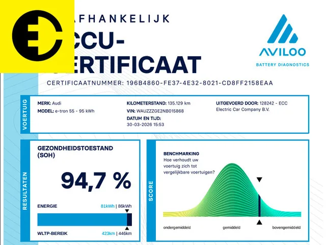 Welkom bij ECC Electric Car Company. Let op: We zijn uitsluitend geopend op afspraak. Wij zijn volledig gespecialiseerd in de verkoop van elektrische voertuigen . Indien u vragen heeft kunt u ons bereiken op +31 320 726 000 of via verkoop@electriccarcompany.nl. De vraagprijs van €29.950 is een meeneemprijs inclusief afleverkosten. Er komen geen afleverkosten meer bij de vraagprijs. Het betreft een BTW auto. Let op, SOH is 94,7%. Omschrijving: Deze Audi E-Tron sportback is voorzien van werkelijk waar alle opties. Denk aan een virtual cockpit,  20 inch lichtmetalen velgen, Memory seats, elektrische achterklep, S interieur, leren/alcantara bekleding, schakelflippers, stoelverwarming, Apple Carplay, Audi Drive select, Quattro, Luchtvering en nog veel meer. Voor deze Audi E-tron krijgt u 30% korting op het reguliere tarief  tot 2030. Interesse? Mail,bel of WhatsApp ons! Exclusieve voordelen van ECC Electric Car Company:  . Volledige kennis over elektrisch rijden; Gespecialiseerd in Tesla...