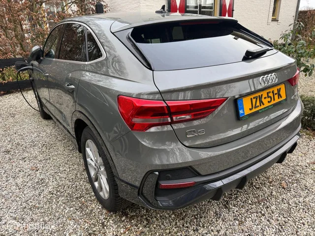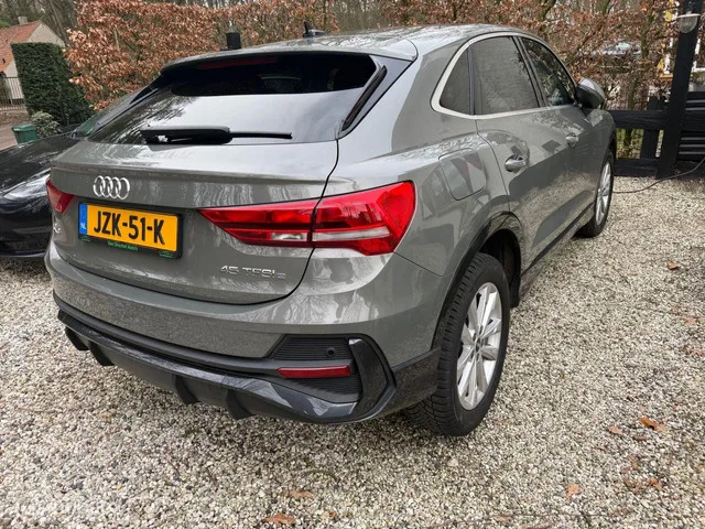 Audi Q3 45 TFSI Sportback e S edition. Kenteken: JZK-51-K; Merk: Audi; Model: Q3; APK tot: 22-11-2026; Tellerstand: 181395 KM; Carrosserievorm: SUV; Aantal deuren: 5; Brandstofsoort: Hybride (Elektrisch/Benzine); Accucapaciteit: 13 kWh; Bouwjaar: 2021; Transmissie: Automaat; Kleur: grijs; Motorinhoud: 1395 cc; Aantal cilinders: 4; Motorcode: DGE; Vermogen: 180 kW / 245pk; Ledig gewicht: 1715 kg; Max. trekgewicht: 1400 kg; Aantal zitplaatsen: 5; Verbruik: 1.6 l/100 km; BTW/Marge: BTW aftrekbaar, de prijs is inclusief BTW; Lengte: 450 cm; Breedte: 184 cm; Aantal sleutels: 2; Onderhoudshistorie aanwezig: Dealer onderhouden; Motorrijtuigenbelasting: € 307 - 335 per kwartaal; Emissieklasse: Euro 6. Comfort. Cruise control; Regensensor. Exterieur. Buitenspiegels elektrisch verstel- en verwarmbaar; Buitenspiegels in carrosseriekleur; Centrale vergrendeling met afstandsbediening; Dakrails; Dimlichten automatisch; Elektrisch bedienbare achterklep; Koplampen adaptief; LED achterlichten; LED...