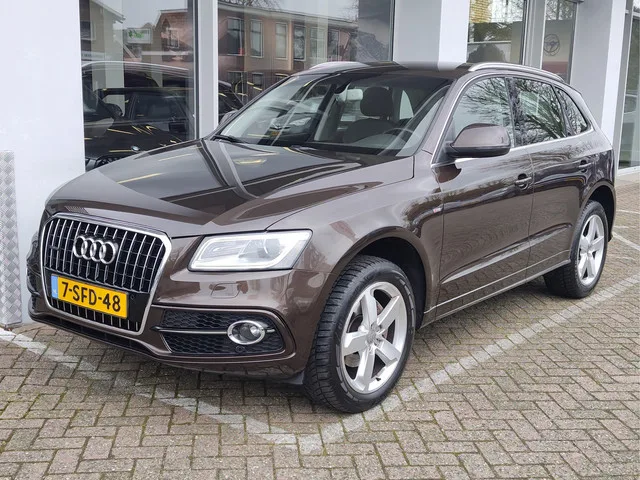 Zeer nette en goed onderhouden Q5 in het prachtige Teak Brown Metallic, een kleur die de auto naast zijn sportieve S-line uitstraling ook een chique tint meegeeft. Door het lichte interieur komt dat chique ook vanbinnen terug, en dat is opzich ook helemaal niet vreemd want met opties als stoelverwarming, navigatie, cruise control en bi-xenon koplampen is het voor zijn tijd ook een uitzonderlijk luxe wagen. De Audi rijdt perfect, de automaat schakelt boterzacht en uit de voorinspectie kwamen geen technische problemen naar voren. Daarom ook geleverd inlcusief 6 maanden BOVAG garantie, onderhoud en een nieuwe APK! 8 versn., Automaat; Modeljaar: 2013; 4WD; 165 kW; 350 Nm; 4 cilinders; 1.984cc; Gewicht: 1.730kg; Laadvermogen: 635kg; GVW: 2.365kg; Max. trekgewicht: 2.000kg; LxBxH: 474x193x167cm; Wielbasis: 281cm; 75l tank; 0-100 km/h: 7,1s; Topsnelheid: 222km/u; Interieurkleur: beige; 7,9 l/100km; 9,6 l/100km; 6,9 l/100km; 184 g/km CO₂; Energielabel C; Euro 5; Aantal eigenaren: 2; 2...