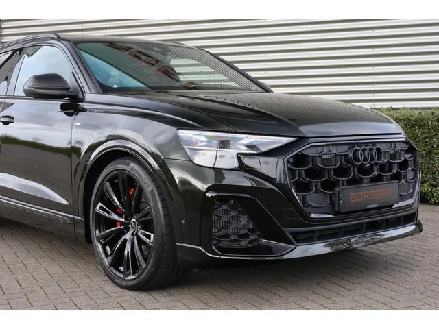 Borgers heeft weer een speciale Audi Q8 beschikbaar! Het betreft een Q8 60 TFSIe met 490 PK in het Audi Exclusive Dark Olive en zeer compleet uitgevoerd met o.a.: 23 inch lichtmetalen Audi Sport velgen in 10-spaak Trapeze-design (hoogglans zwart); Adaptieve ruitenwissers met geïntegreerde ruitensproeiers; Akoestisch glas in de voor- en achterportieren; Ambiente-plus-lichtpakket (in meerdere kleuren instelbaar); Assistentiepakket City (o.a.: side assist met uitstapwaarschuwing); Assistentiepakket Parking en parkeerassistent plus (topview 360 graden camera's incl. parkeerhulp, inparkeersysteem); Assistentiepakket Tour (o.a.: adaptive cruise control, lane assist); Audi connect key; Audi phone box met wirelles charging; Audi pre sense rear-pakket (o.a.: zij-airbags achter inclusief verlichte gordelaansluiting); Audi smartphone interface (o.a.: Apple Carplay); Audi Sport rode stiksels (interieurafwerking met rode stiksels, veiligheidsgordels in rood); Audi virtual cockpit plus...