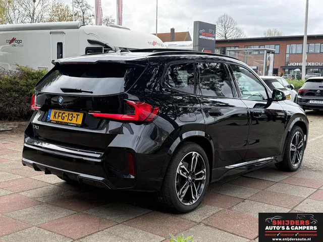 BMW iX1 xDrive30 67 kWh M Sport beige leder. Kenteken: KFG-13-T; Merk: BMW; Model: iX1; APK tot: 08-09-2027; Tellerstand: 20000 KM; Carrosserievorm: SUV; Aantal deuren: 5; Brandstofsoort: Elektrisch; Accucapaciteit: 67 kWh; Actieradius: 438 km; Bouwjaar: 2023; Transmissie: Automaat; Kleur: zwart Metallic; Kleurnaam: BLACK SAPPHIRE METALLIC (475); Bekleding: Leder; Kleur interieur: beige; Interieurnaam: VEGANZA PERFORIERT OYSTER (KUCX); Vermogen: 225 kW / 306pk; Ledig gewicht: 1985 kg; Aantal zitplaatsen: 5; BTW/Marge: BTW aftrekbaar, de prijs is inclusief BTW; Aantal sleutels: 2. Pakket: Driving Assistant Professional. Achteruitrij assistent; Automatische snelheidsbegrenzing ISA; Cruise control adaptief met Stop&Go; Cruise control adaptief met Stop&Go en stuurhulp; Dodehoek detectie; File assistent; Kruisend verkeer detectie; Rijstrooksensor met correctie; Uitstap waarschuwing; Uitwijk assistent. Pakket: M Sportpakket. Achterspoiler onderscheidend; Aluminium interieur afwerking...