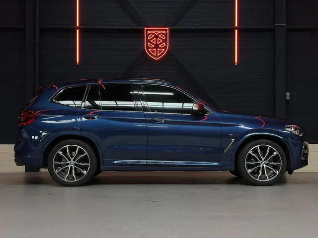 BMW X3 M40i xDrive High Exec. |H&K|CAMERA|MEM.|STUURVERW.|APP. Merk: BMW; Model: X3; APK tot: 24-11-2026; Tellerstand: 119939 KM; Carrosserievorm: SUV; Aantal deuren: 5; Brandstofsoort: Benzine; Bouwjaar: 2018; Transmissie: Automaat 8-traps; Kleur: blauw Metallic; Kleurnaam: Phytonic Blue; Bekleding: Leder; Kleur interieur: zwart; Motorinhoud: 2998 cc; Aantal cilinders: 6; Motorcode: B58B30A; Vermogen: 265 kW / 361pk; Ledig gewicht: 1785 kg; Max. trekgewicht: 2000 kg; Aantal zitplaatsen: 5; Verbruik: 8.2 l/100 km; BTW/Marge: Marge, de BTW is niet aftrekbaar; Lengte: 472 cm; Breedte: 190 cm; Hoogte: 1676 cm; Aantal sleutels: 2; Onderhoudshistorie aanwezig: Dealer onderhouden; Motorrijtuigenbelasting: € 333 - 365 per kwartaal; Emissieklasse: Euro 6. Bijzondere opties & accessoires. Audio installatie premium; Dakrails; Draadloze telefoonlader; Elektrisch verstelb. bestuurdersstoel met geheugen; Harman Kardon; LED koplampen; Lederen bekleding; M Aerodynamica; Memory functie...