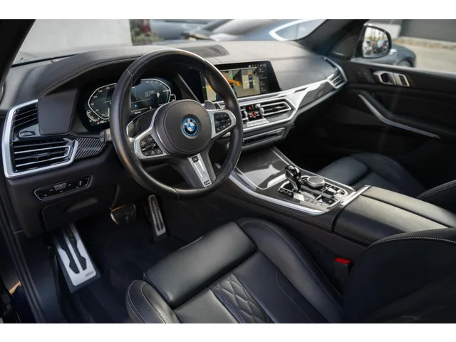 BMW X5 xDrive45e M-Sport 1e eigenaar, dealer onderhouden, H&K, Massage, M Perf Seats, Carbon, Sky Lounge, 360c, Stoelventilatie. BMW X5 xDrive45e M-Sport Massage Perf Seats Carbon SkyLounge. Merk: BMW; Model: X5; APK tot: 02-12-2027; Tellerstand: 82214 KM; Carrosserievorm: SUV; Aantal deuren: 5; Brandstofsoort: Hybride (Elektrisch/Benzine); Bouwjaar: 2022; Transmissie: Automaat 8 traps; Kleur: blauw Metallic; Kleurnaam: Tansanitblauw; Bekleding: Leder; Kleur interieur: zwart; Interieurnaam: Merino; Motorinhoud: 2998 cc; Aantal cilinders: 6; Vermogen: 289 kW / 394pk; Ledig gewicht: 2410 kg; Aantal zitplaatsen: 5; Verbruik: 1.2 l/100 km; BTW/Marge: BTW aftrekbaar, de prijs is inclusief BTW; Aantal sleutels: 2; Onderhoudshistorie aanwezig: Dealer onderhouden; Motorrijtuigenbelasting: € 354 - 388 per kwartaal. Pakket: Comfort Access pakket. Elektrisch bedienbare achterklep; Elektrisch bedienbare achterklep met sensorsturing; Keyless entry. Pakket: Driving Assistant. Achteruitrij...