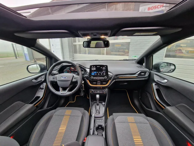 Ford Fiesta 1.0 EcoBoost Active|ACC|B&O|Pano|Trekhaak|Carplay|. Kenteken: TR-842-G; Merk: Ford; Model: Fiesta; APK tot: 23-02-2027; Tellerstand: 105052 KM; Carrosserievorm: Hatchback; Aantal deuren: 5; Brandstofsoort: Benzine; Bouwjaar: 2018; Transmissie: Automaat; Kleur: grijs; Motorinhoud: 998 cc; Aantal cilinders: 3; Motorcode: SFJP; Vermogen: 73 kW / 99pk; Ledig gewicht: 1184 kg; Aantal zitplaatsen: 5; Verbruik: 6.1 l/100 km; BTW/Marge: Marge, de BTW is niet aftrekbaar; Lengte: 407 cm; Breedte: 176 cm; Aantal sleutels: 2; Onderhoudshistorie aanwezig: Ja; Motorrijtuigenbelasting: € 172 - 188 per kwartaal; Emissieklasse: Euro 6. Pakket: Driver Assistance Pack 3. Autonomous Emergency Braking; Bots waarschuwing systeem; Cruise control adaptief. Pakket: Navigation Pack. Airco automatisch; DAB; Navigatiesysteem full map. Pakket: Winter pack. Verwarmde voorruit; Voorstoelen verwarmd. Pakket: Parking Pack. Achteruitrijcamera; Parkeersensor achter. Comfort. Boordcomputer; Cruise control...