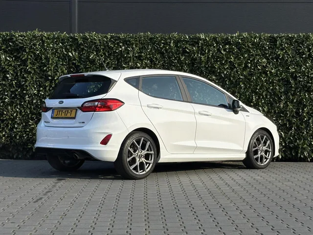 Ford Fiesta 1.0 EcoBoost Hybrid, NIEUW MODEL, ST-LINE, CARPLAY, NAVI, KEYLESS, LANE ASSIST, CRUISE CONTROL, CLIMATE CONTROL, STOEL/STUURVERWARMING, DAB, LED, PDC, LICHTMETAAL 17". Kenteken: JTT-17-T; Merk: Ford; Model: Fiesta; APK tot: 20-06-2026; Tellerstand: 64524 KM; Carrosserievorm: Hatchback; Aantal deuren: 5; Brandstofsoort: Benzine; Bouwjaar: 2022; Transmissie: Handgeschakeld; Kleur: wit; Motorinhoud: 998 cc; Aantal cilinders: 3; Motorcode: BZJA; Vermogen: 114 kW / 155pk; Ledig gewicht: 1148 kg; Max. trekgewicht: 1000 kg; Aantal zitplaatsen: 5; Verbruik: 4.3 l/100 km; BTW/Marge: Marge, de BTW is niet aftrekbaar; Motorrijtuigenbelasting: € 145 - 158 per kwartaal; Emissieklasse: Euro 6. Pakket: Parking Pack. Parkeer assistent; Parkeersensor voor. Pakket: Winter pack. Stuur verwarmd; Verwarmde voorruit; Voorstoelen verwarmd. Comfort. Boordcomputer; Cruise control; Regensensor. Exterieur. Achterruitwisser; Buitenspiegels elektrisch verstel- en verwarmbaar; Buitenspiegels...