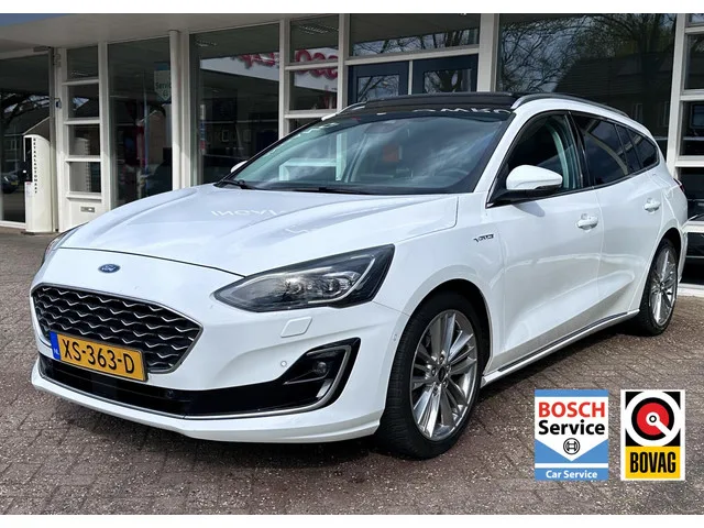 Ford Focus Wagon 1.0 EcoBoost Vignale Led, Pano, Leer, Camera, LM.. Kenteken: XS-363-D; Merk: Ford; Model: Focus Wagon; APK tot: 15-03-2027; Tellerstand: 197512 KM; Carrosserievorm: Station; Aantal deuren: 5; Brandstofsoort: Benzine; Bouwjaar: 2019; Transmissie: Handgeschakeld; Kleur: wit Metallic; Motorinhoud: 999 cc; Aantal cilinders: 3; Motorcode: B7DA; Vermogen: 92 kW / 125pk; Ledig gewicht: 1283 kg; Max. trekgewicht: 1000 kg; Aantal zitplaatsen: 5; Verbruik: 5.1 l/100 km; BTW/Marge: Marge, de BTW is niet aftrekbaar; Lengte: 469 cm; Breedte: 184 cm; Onderhoudshistorie aanwezig: Ja; Motorrijtuigenbelasting: € 199 - 217 per kwartaal; Emissieklasse: Euro 6. Comfort. Boordcomputer; Cruise control; Regensensor. Exterieur. Achterruitwisser; Buitenspiegels elektrisch verstel- en verwarmbaar; Centrale vergrendeling met afstandsbediening; Chroom delen exterieur; Dakrails; Dakspoiler; Dimlichten automatisch; Getint glas; Keyless entry; LED achterlichten; LED dagrijverlichting; LED...