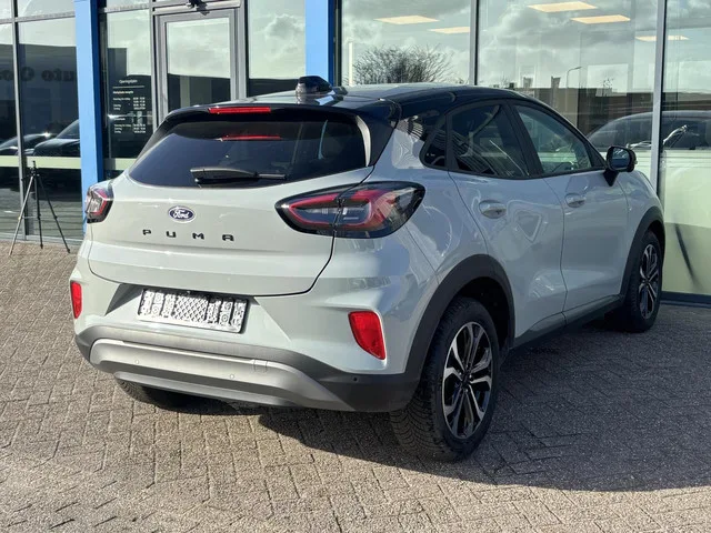 Ford Puma 1.0 EcoBoost Hybrid Titanium 125PK NIEUW MODEL!!! Winterpack Adaptieve Cruise Elek. Achterklep Blind-Spot Navi 360 Camera Keyless All Seasons *Compleet*. Kenteken: F83282; Merk: Ford; Model: Puma; APK tot: 26-12-2028; Tellerstand: 7245 KM; Carrosserievorm: SUV; Aantal deuren: 5; Brandstofsoort: Benzine; Bouwjaar: 2024; Transmissie: Handgeschakeld; Kleur: grijs; Kleurnaam: Cactus Grey; Bekleding: Stof; Kleur interieur: zwart; Motorinhoud: 999 cc; Aantal cilinders: 3; Vermogen: 92 kW / 125pk; Ledig gewicht: 1180 kg; Max. trekgewicht: 1100 kg; Aantal zitplaatsen: 5; Verbruik: 5.4 l/100 km; BTW/Marge: BTW aftrekbaar, de prijs is inclusief BTW; Aantal sleutels: 2; Onderhoudshistorie aanwezig: Dealer onderhouden; Motorrijtuigenbelasting: € 172 - 188 per kwartaal; Fabrieksgarantie tot: 26-12-2026. Pakket: Winter pack. Stuur verwarmd; Verwarmde voorruit; Voorstoelen verwarmd. Pakket: Driver Assistance Pack. Autonomous Emergency Braking; Buitenspiegels elektrisch inklapbaar...