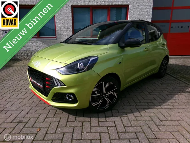 Hyundai i10 1.0 T-GDI N Line. Merk: Hyundai; Model: i10; Tellerstand: 13682 KM; Carrosserievorm: Hatchback; Aantal deuren: 5; Brandstofsoort: Benzine; Bouwjaar: 2025; Transmissie: Handgeschakeld 6; Kleur: geel Metallic; Bekleding: Stof; Kleur interieur: zwart; Motorinhoud: 998 cc; Aantal cilinders: 3; Vermogen: 66 kW / 90pk; Ledig gewicht: 999 kg; Aantal zitplaatsen: 5; Verbruik: 5.4 l/100 km; BTW/Marge: Marge, de BTW is niet aftrekbaar; Aantal sleutels: 2; Onderhoudshistorie aanwezig: Ja. Comfort. Boordcomputer; Cruise control. Exterieur. Buitenspiegels elektrisch inklapbaar; Buitenspiegels elektrisch verstelbaar; Buitenspiegels verwarmbaar; Bumpers in carrosseriekleur; Centrale vergrendeling met afstandsbediening; Dakspoiler; Dimlichten automatisch; Extra getint glas achter; Koplampen adaptief; LED achterlichten; LED dagrijverlichting; Lichtmetalen velgen 16"; Metaalkleur; Parkeersensor achter; Two-tone metaalkleur. Infotainment. Audio-navigatie full map; Multimedia-voorbereiding...