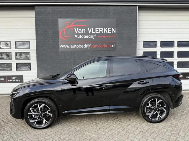 Hyundai Tucson 1.6 T-GDI HEV N Line. Algemene gegevens. Kenteken: KBV-36-D. Tellerstand: 6132 KM. Carrosserievorm: SUV. Aantal deuren: 5. Brandstofsoort: Hybride (Elektrisch/Benzine). Bouwjaar: 2025. Transmissie: Automaat. Kleur: Zwart. Onderhoudshistorie aanwezig: Dealer onderhouden. Aantal maanden fabrieksgarantie: 60. Technische gegevens. Motorinhoud: 1598 cc. Aantal cilinders: 4. Vermogen: 158 kW / 215pk. Koppel: 264Nm. Ledig gewicht: 1550 kg. Max. trekgewicht: 1360 kg. Emissieklasse: Euro 6. Acceleratie (0-100 km/h): 8.2 seconden. Topsnelheid: 186 km/h. Gemiddeld verbruik (gecombineerd): 5.6 l/100km. Functionaliteit. Lengte (cm): 452 cm. Breedte (cm): 187 cm. Financiële gegevens. Motorrijtuigenbelasting: € 253 - 276 per kwartaal. Oorspronkelijke cataloguswaarde: € 52622 (incl. 21% BTW, incl. BPM). BTW/Marge: Marge, de BTW is niet aftrekbaar. Comfort. Regensensor. Exterieur. Achterruitverwarming; Buitenspiegels elektrisch inklapbaar; Buitenspiegels elektrisch verstelbaar...