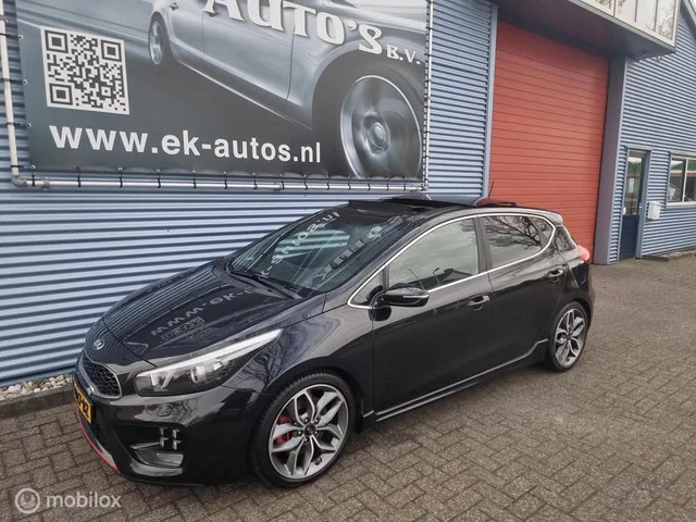 Kia cee'd 1.6 Turbo GT Sport 205pk. Leder, Stoel en stuurverwarming, DAB+ radio, Camera, Cruise, ECC, Xenon, LED, Panodak, Keyless. Kia cee'd 1.6 T-GDi GT Sport 205pk. Keurig !! Alle opties !! Kenteken: K-027-BZ; Merk: Kia; Model: cee'd; APK tot: 10-04-2027; Tellerstand: 182379 KM; Carrosserievorm: Hatchback; Aantal deuren: 5; Brandstofsoort: Benzine; Bouwjaar: 2016; Transmissie: Handgeschakeld 6-vers; Kleur: zwart Metallic; Bekleding: Leder/Alcantara; Kleur interieur: zwart; Interieurnaam: GT sport seats; Motorinhoud: 1591 cc; Aantal cilinders: 4; Motorcode: G4FJ; Vermogen: 150 kW / 204pk; Ledig gewicht: 1367 kg; Max. trekgewicht: 1400 kg; Aantal zitplaatsen: 5; Verbruik: 7.4 l/100 km; BTW/Marge: Marge, de BTW is niet aftrekbaar; Lengte: 431 cm; Breedte: 178 cm; Aantal sleutels: 2; Onderhoudshistorie aanwezig: Ja; Motorrijtuigenbelasting: € 226 - 247 per kwartaal; Emissieklasse: Euro 6. Comfort. Cruise control; Regensensor. Exterieur. Achterruitwisser; Achterspoiler; Bi-xenon...