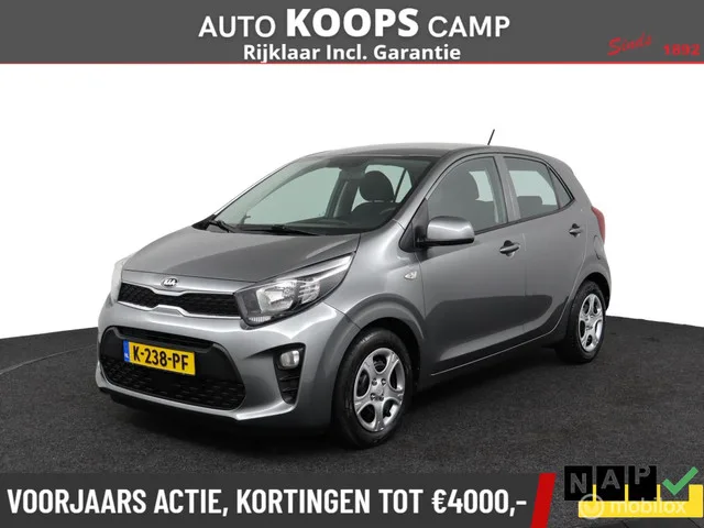 Kia Picanto 1.0 DPi ComfortLine | NAP | Elec. Pakket | Airco | Bluetooth | bediening op stuur | Dealerstaat |. Kenteken: K-238-PF; Merk: Kia; Model: Picanto; APK tot: 23-12-2027; Tellerstand: 52321 KM; Carrosserievorm: Hatchback; Aantal deuren: 5; Brandstofsoort: Benzine; Bouwjaar: 2021; Transmissie: Handgeschakeld; Kleur: grijs; Motorinhoud: 998 cc; Aantal cilinders: 3; Motorcode: G3LD; Vermogen: 49 kW / 67pk; Ledig gewicht: 874 kg; Aantal zitplaatsen: 4; Verbruik: 4.2 l/100 km; BTW/Marge: BTW aftrekbaar, de prijs is inclusief BTW; Lengte: 360 cm; Breedte: 160 cm; Motorrijtuigenbelasting: € 92 - 99 per kwartaal; Emissieklasse: Euro 6. Comfort. Cruise control. Exterieur. Buitenspiegel rechts; Centrale vergrendeling; Centrale vergrendeling met afstandsbediening; Chroom delen exterieur; Dimlichten automatisch. Infotainment. DAB; Mp3-speler; Multimedia-voorbereiding; Radio; Stuur multifunctioneel. Interieur. Achterbank in delen neerklapbaar; Airco; Bestuurdersstoel in hoogte...