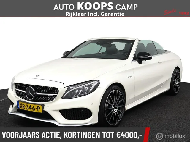 Mercedes-Benz C-klasse Cabrio AMG 43 4MATIC 367Pk Aut-9 | Zwart-leder | Stoelverw./koeling | Sportuitlaat | parelmoer wit metallic | Carbon inleg |elec. stoelen met geheugen| Burmester Audio | DEALER-STAAT. Kenteken: XR-346-P; Merk: Mercedes-Benz; Model: C-klasse Cabriolet; APK tot: 02-02-2027; Tellerstand: 122422 KM; Carrosserievorm: Cabrio; Aantal deuren: 2; Brandstofsoort: Benzine; Bouwjaar: 2018; Transmissie: Automaat; Kleur: wit; Motorinhoud: 2996 cc; Aantal cilinders: 6; Motorcode: 276823; Vermogen: 270 kW / 368pk; Ledig gewicht: 1770 kg; Max. trekgewicht: 1000 kg; Aantal zitplaatsen: 4; Verbruik: 8.4 l/100 km; BTW/Marge: Marge, de BTW is niet aftrekbaar; Motorrijtuigenbelasting: € 333 - 365 per kwartaal; Emissieklasse: Euro 6. Bijzondere opties & accessoires. Voorstoelen verwarmd en geventileerd. Comfort. Cruise control; Regensensor. Exterieur. AMG-styling; Achterspoiler; Adaptief demping systeem; Aluminium delen exterieur; Buitenspiegels elektrisch verstel- en verwarmbaar...