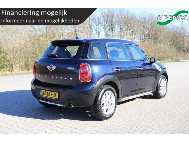 Mini Countryman 1.6 Cooper | leder | climate & cruise control | navigatie | bluetooth | origineel nl auto |. Kenteken: KZ-187-D; Merk: Mini; Model: Countryman; APK tot: 26-02-2027; Tellerstand: 126756 KM; Carrosserievorm: SUV; Aantal deuren: 5; Brandstofsoort: Benzine; Bouwjaar: 2017; Transmissie: Handgeschakeld 6-bak; Kleur: blauw Metallic; Bekleding: Leder; Kleur interieur: zwart; Motorinhoud: 1598 cc; Aantal cilinders: 4; Motorcode: N16B16A; Vermogen: 90 kW / 123pk; Ledig gewicht: 1240 kg; Aantal zitplaatsen: 5; Verbruik: 6.1 l/100 km; BTW/Marge: Marge, de BTW is niet aftrekbaar; Lengte: 410 cm; Breedte: 179 cm; Hoogte: 1544 cm; Aantal sleutels: 2; Motorrijtuigenbelasting: € 172 - 188 per kwartaal; Emissieklasse: Euro 6. Comfort. Boordcomputer; Cruise control; Regensensor. Exterieur. Achterruitwisser; Buitenspiegels elektrisch verstelbaar; Centrale vergrendeling met afstandsbediening; Chroom delen exterieur; Dimlichten automatisch en regensensor. Infotainment. ...