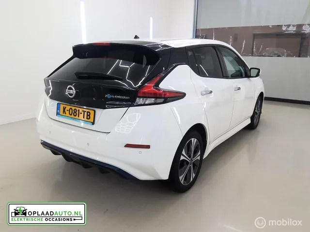 Word verwacht. Nissan LEAF e+ N-Connecta 62 kWh | 1 eigenaar | Dealer onderhouden. Nissan LEAF e+ N-Connecta 62 kWh | Eerste eigenaar | Dealer OH. Kenteken: K-081-TB; Merk: Nissan; Model: LEAF; APK tot: 27-02-2027; Tellerstand: 26966 KM; Carrosserievorm: Hatchback; Aantal deuren: 5; Brandstofsoort: Elektrisch; Accucapaciteit: 62 kWh; Actieradius: 385 km; Geschikt voor snelladen: Ja; Stekkeraansluiting snelladen: CHAdeMO 4-pins; Bouwjaar: 2021; Transmissie: Automaat; Kleur: wit; Motorcode: EM57; Vermogen: 160 kW / 218pk; Ledig gewicht: 1656 kg; Aantal zitplaatsen: 5; BTW/Marge: BTW aftrekbaar, de prijs is inclusief BTW; Lengte: 449 cm; Breedte: 179 cm; Aantal sleutels: 2; Onderhoudshistorie aanwezig: Ja; Motorrijtuigenbelasting: € 214 - 234 per kwartaal; Emissieklasse: Euro Z. Comfort. Boordcomputer; Regensensor. Exterieur. Buitenspiegels elektrisch inklapbaar; Buitenspiegels elektrisch verstelbaar; Buitenspiegels in carrosseriekleur; Buitenspiegels verwarmbaar; Chroom delen...