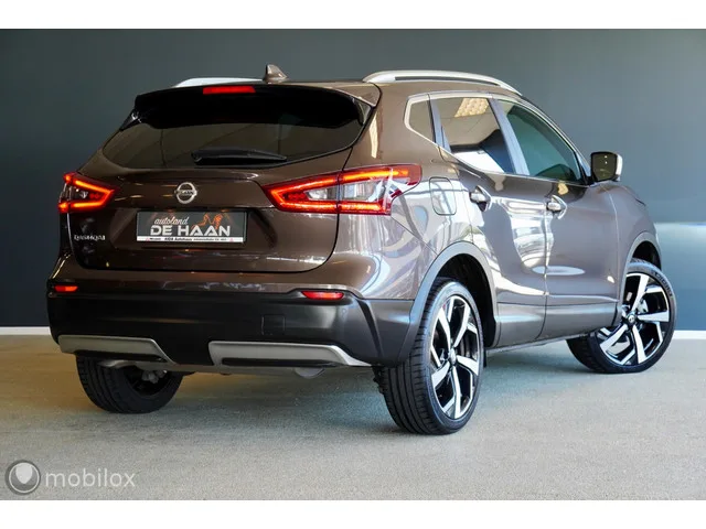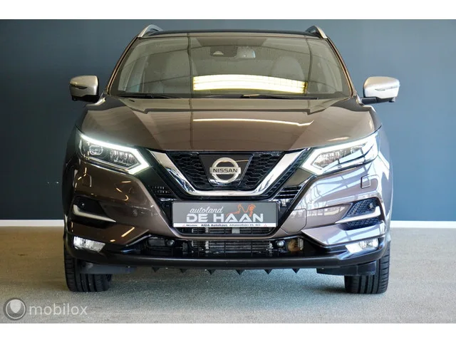Nissan Qashqai1.3 DIG-T TEKNA met NAVIGATIE, PANORAMADAK, 360"CAMERA, LEER, EL STOELEN, 19 INCH, 360 CAMERA, APPLE CARPLAY, CLIMA. Nissan Qashqai 1.3 Tekna NAVI PANO APPLE CARPLAY CAMERA LEER. Merk: Nissan; Model: Qashqai 1 JAAR GARANTIE; APK tot: 06-01-2028; Tellerstand: 93997 KM; Carrosserievorm: SUV; Aantal deuren: 5; Brandstofsoort: Benzine; Bouwjaar: 2019; Transmissie: Handgeschakeld; Kleur: bruin; Bekleding: Leder/Stof; Kleur interieur: zwart; Motorinhoud: 1332 cc; Aantal cilinders: 4; Vermogen: 103 kW / 140pk; Ledig gewicht: 1260 kg; Aantal zitplaatsen: 5; Verbruik: 5.6 l/100 km; BTW/Marge: Marge, de BTW is niet aftrekbaar; Aantal sleutels: 2; Onderhoudshistorie aanwezig: Dealer onderhouden. Comfort. Cruise control. Exterieur. Achterruitwisser; Banden controle systeem; Buitenspiegels elektrisch inklapbaar; Buitenspiegels elektrisch verstelbaar; Centrale vergrendeling; Chroom delen exterieur; D Mode (helderheid instelling); Dakrails; Dimlichten automatisch; Extra getint glas...