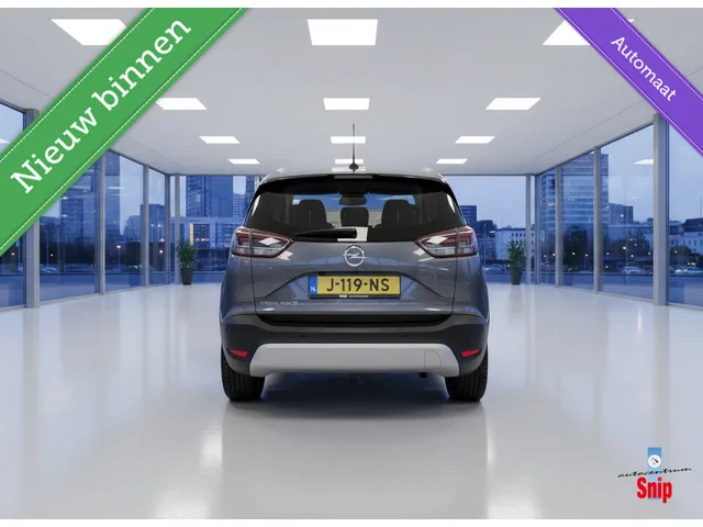 Opel Crossland X 1.2 Turbo Ultimate. Kenteken: J-119-NS; Merk: Opel; Model: Crossland X; APK tot: 01-04-2027; Tellerstand: 82192 KM; Carrosserievorm: SUV; Aantal deuren: 5; Brandstofsoort: Benzine; Bouwjaar: 2019; Transmissie: Automaat; Kleur: grijs Metallic; Motorinhoud: 1199 cc; Aantal cilinders: 3; Motorcode: EB2ADT; Vermogen: 81 kW / 110pk; Ledig gewicht: 1178 kg; Max. trekgewicht: 840 kg; Aantal zitplaatsen: 5; Verbruik: 5.6 l/100 km; BTW/Marge: Marge, de BTW is niet aftrekbaar; Lengte: 421 cm; Breedte: 177 cm; Hoogte: 1605 cm; Aantal sleutels: 2; Onderhoudshistorie aanwezig: Ja; Motorrijtuigenbelasting: € 172 - 188 per kwartaal; Emissieklasse: Euro 6. Comfort. Cruise control; Regensensor. Exterieur. Achterspoiler; Andere dakkleur; Buitenspiegels elektrisch inklapbaar; Buitenspiegels elektrisch verstel- en verwarmbaar; Chroom delen exterieur; Dakrails; Dimlichten automatisch; Extra getint glas achter; Keyless entry; Koplampen adaptief; LED achterlichten; LED dagrijverlichting...