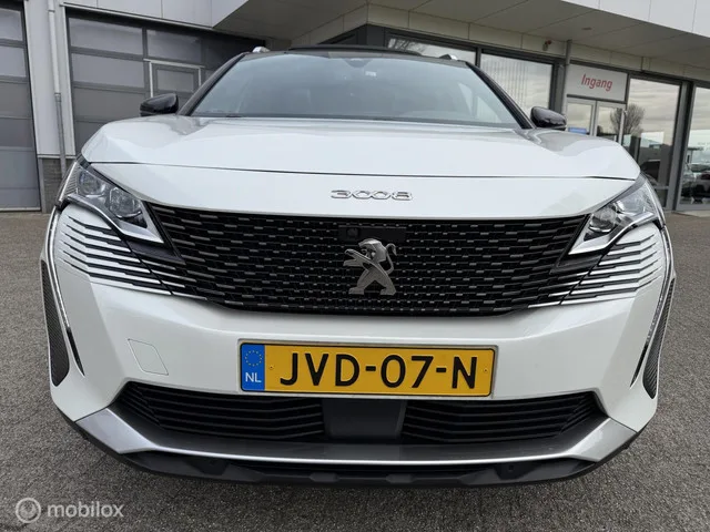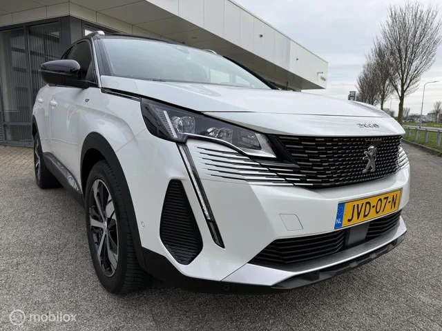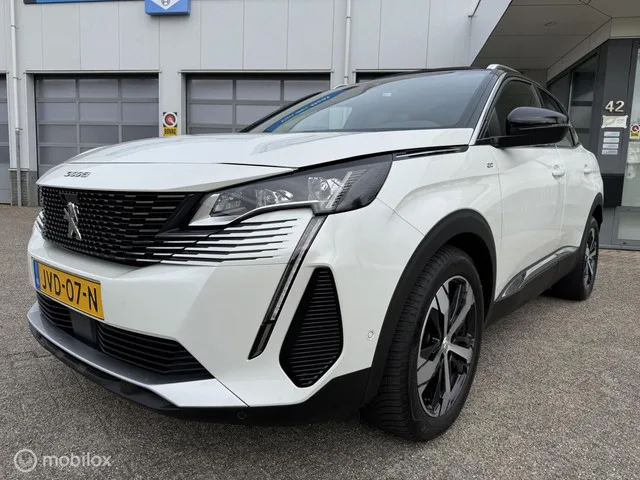 PEUGEOT 3008 180 PK GT 12 MND BOVAG RIJKLAAR PRIJS. Kenteken: JVD-07-N; Merk: Peugeot; Model: 3008; APK tot: 27-03-2027; Tellerstand: 32267 KM; Carrosserievorm: SUV; Aantal deuren: 5; Brandstofsoort: Benzine; Bouwjaar: 2022; Transmissie: Automaat; Kleur: wit Metallic; Bekleding: Leder/Alcantara; Kleur interieur: antraciet; Motorinhoud: 1598 cc; Aantal cilinders: 4; Motorcode: 5G06; Vermogen: 133 kW / 181pk; Ledig gewicht: 1404 kg; Max. trekgewicht: 1500 kg; Aantal zitplaatsen: 5; Verbruik: 4.9 l/100 km; BTW/Marge: Marge, de BTW is niet aftrekbaar; Lengte: 445 cm; Breedte: 184 cm; Aantal sleutels: 2; Onderhoudshistorie aanwezig: Ja; Motorrijtuigenbelasting: € 226 - 247 per kwartaal; Emissieklasse: Euro 6. Comfort. Cruise control; Regensensor. Exterieur. Andere dakkleur; Buitenspiegels elektrisch inklapbaar; Buitenspiegels elektrisch verstel- en verwarmbaar; Buitenspiegels in carrosseriekleur; Buitenspiegels met verlichting; Centrale vergrendeling met afstandsbediening; Chroom delen...