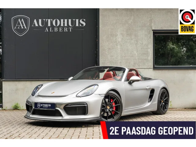 Porsche 981 Boxster Spyder 3.8 2e eigenaar, Porsche onderhouden, Gelimiteerde oplage, GT Silver Met, 375PK, Carbon 918 Kuipstoelen, Bose. Porsche 981 Boxster Spyder 3.8 Limited Carbon 918 kuipstoelen. Merk: Porsche; Model: Boxster Spyder; Tellerstand: 30365 KM; Carrosserievorm: Cabrio; Aantal deuren: 2; Brandstofsoort: Benzine; Bouwjaar: 2016; Transmissie: Handgeschakeld; Kleur: grijs Metallic; Kleurnaam: GT Silver; Bekleding: Leder; Kleur interieur: rood; Motorinhoud: 3800 cc; Aantal cilinders: 6; Motorcode: DBX; Vermogen: 276 kW / 376pk; Ledig gewicht: 1290 kg; Aantal zitplaatsen: 2; Verbruik: 9.9 l/100 km; BTW/Marge: Marge, de BTW is niet aftrekbaar; Lengte: 441 cm; Hoogte: 1262 cm; Aantal sleutels: 2; Onderhoudshistorie aanwezig: Dealer onderhouden; Motorrijtuigenbelasting: € 190 - 207 per kwartaal; Emissieklasse: Euro 6. Comfort. Boordcomputer; Cruise control. Exterieur. Adaptief demping systeem; Bi-xenon koplampen; Buitenspiegels elektrisch verstel- en verwarmbaar; Centrale...