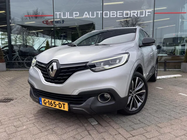 Zeer nette Renault Kadjar 1.2 TCe Bose Automaat bj 2017 HalfLder stof Navi Camera Clima Trekhaak.... Renault Kadjar 1.2 TCe Bose Automaat 2017 Navi Top staat. Kenteken: G-165-DT; Merk: Renault; Model: Kadjar; APK tot: 02-08-2026; Tellerstand: 103304 KM; Carrosserievorm: SUV; Aantal deuren: 5; Brandstofsoort: Benzine; Bouwjaar: 2017; Transmissie: Automaat; Kleur: grijs Metallic; Bekleding: Leder/Stof; Kleur interieur: zwart; Motorinhoud: 1198 cc; Aantal cilinders: 4; Motorcode: H5F F4; Vermogen: 96 kW / 131pk; Ledig gewicht: 1348 kg; Max. trekgewicht: 1500 kg; Aantal zitplaatsen: 5; Verbruik: 5.9 l/100 km; BTW/Marge: Marge, de BTW is niet aftrekbaar; Lengte: 445 cm; Breedte: 184 cm; Aantal sleutels: 2; Motorrijtuigenbelasting: € 199 - 217 per kwartaal; Emissieklasse: Euro 6. Comfort. Boordcomputer; Cruise control; Regensensor. Exterieur. Achterruitwisser; Buitenspiegels elektrisch inklapbaar; Buitenspiegels elektrisch verstel- en verwarmbaar; Buitenspiegels in carrosseriekleur...