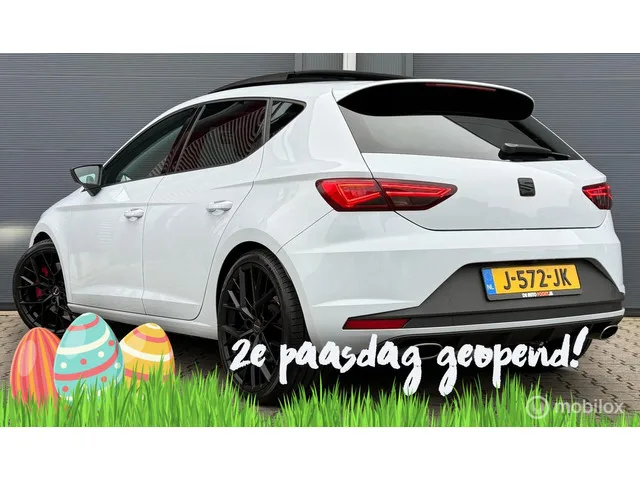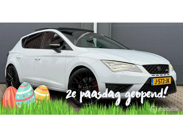 Seat Leon 2.0 TSI Cupra 280 DSG Pano.dak/Full-LED/Clima/Cruise/. Kenteken: J-572-JK; Merk: Seat; Model: Leon; APK tot: 15-05-2026; Tellerstand: 178122 KM; Carrosserievorm: Hatchback; Aantal deuren: 5; Brandstofsoort: Benzine; Bouwjaar: 2014; Transmissie: Automaat; Kleur: grijs Metallic; Motorinhoud: 1984 cc; Aantal cilinders: 4; Motorcode: CJX; Vermogen: 206 kW / 281pk; Ledig gewicht: 1321 kg; Aantal zitplaatsen: 5; Verbruik: 6.6 l/100 km; BTW/Marge: Marge, de BTW is niet aftrekbaar; Lengte: 426 cm; Breedte: 182 cm; Hoogte: 1459 cm; Onderhoudshistorie aanwezig: Ja; Motorrijtuigenbelasting: € 199 - 217 per kwartaal; Emissieklasse: Euro 6. Pakket: Winter pakket. Koplampreiniging; Ruitensproeiers/wisserbladen verwarmbaar; Voorstoelen verwarmd. Comfort. Boordcomputer; Cruise control; Regensensor. Exterieur. Adaptief demping systeem; Buitenspiegels elektrisch inklapbaar; Buitenspiegels elektrisch verstelbaar; Buitenspiegels verwarmbaar; Centrale vergrendeling met afstandsbediening...