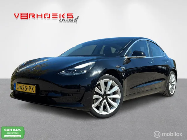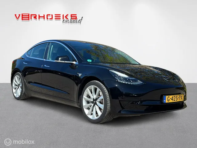Tesla Model 3 Standard RWD Plus + Trekhaak!! BTW!! Kenteken: G-425-PX; Merk: Tesla; Model: Model 3; APK tot: 30-11-2027; Tellerstand: 194570 KM; Carrosserievorm: Hatchback; Aantal deuren: 5; Brandstofsoort: Elektrisch; Accucapaciteit: 60 kWh; Actieradius: 448 km; Accuconditie: 84 %; Geschikt voor snelladen: Ja; Bouwjaar: 2019; Transmissie: Automaat; Kleur: zwart; Kleur interieur: zwart; Motorcode: 3D1; Vermogen: 210 kW / 286pk; Ledig gewicht: 1584 kg; Max. trekgewicht: 1000 kg; Aantal zitplaatsen: 5; BTW/Marge: BTW aftrekbaar, de prijs is inclusief BTW; Lengte: 469 cm; Breedte: 185 cm; Hoogte: 1443 cm; Aantal sleutels: 2; Onderhoudshistorie aanwezig: Dealer onderhouden; Motorrijtuigenbelasting: € 196 - 214 per kwartaal; Emissieklasse: Euro Z. Pakket: Basic Autopilot. Cruise control adaptief met Stop&Go en stuurhulp. Comfort. Regensensor. Exterieur. 19" Aluminium Sportwielen; Achteruitrijcamera; Autopilot; Buitenspiegel rechts; Buitenspiegel(s) automatisch dimmend; Buitenspiegels...