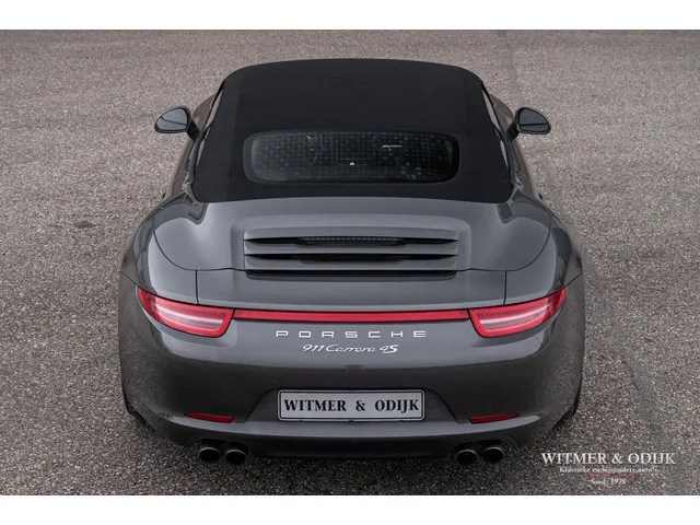 Meer foto's op WWW.WITMERODIJK.NL. Sinds deze 4S is onze showroom staat kreeg ik al bijna 911 complimenten over deze cabriolet, wat een bijzondere Porsche! Zie die stijlvolle carrosseriekleur in combinatie met de bijzondere velgen, de fraaie merk-striping en natuurlijk de configuratie van de auto. Agate Grey Metallic is de lakkleur en er is zwart leer op de sportstoelen, deurpanelen en het dashboard. Ook de kilometerstand heeft deze Carrera 4S mee, slechts 72.300km werd de auto gebruikt in mooi weer en zichtbaar uitermate zorgvuldig. Er is geen zichtbaar gebruiksspoor op de auto, ook het interieur lijkt wel nieuw. Mooi fris zijn de knopjes en schakelaars, instapkant van de stoel niet kaal en de vloerbekleding is foutloos. Zo wil je een 'droomcabrio' in de garage. De optionele 20 inch GTS-look velgen maken deze 991 4S helemaal af. Kijk ook nog even naar de conditie van het cabriodak, geen slijtplek te zien. De belangrijkste opties van deze Porsche zijn; automatische climat control,...