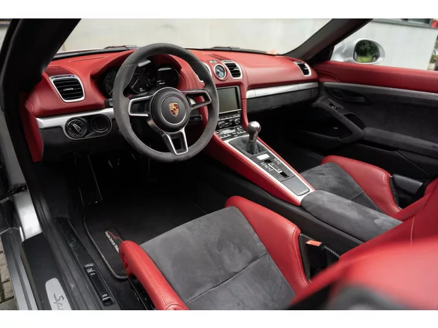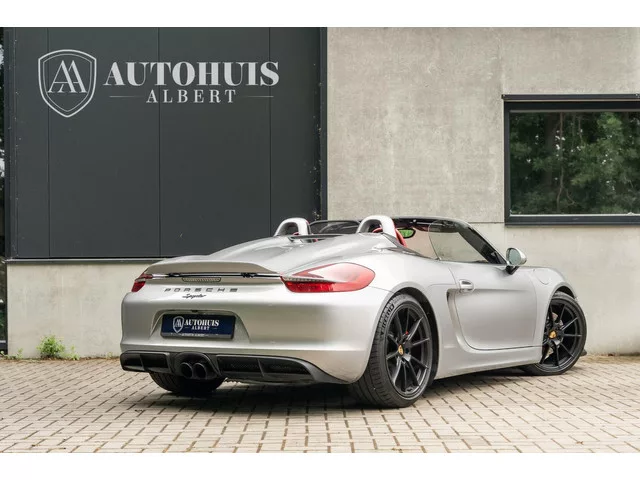 Porsche 981 Boxster Spyder 3.8 2e eigenaar, Porsche onderhouden, Gelimiteerde oplage, GT Silver Met, 375PK, Carbon 918 Kuipstoelen, Bose. Porsche 981 Boxster Spyder 3.8 Limited Carbon 918 kuipstoelen. Merk: Porsche; Model: Boxster Spyder; Tellerstand: 30365 KM; Carrosserievorm: Cabrio; Aantal deuren: 2; Brandstofsoort: Benzine; Bouwjaar: 2016; Transmissie: Handgeschakeld; Kleur: grijs Metallic; Kleurnaam: GT Silver; Bekleding: Leder; Kleur interieur: rood; Motorinhoud: 3800 cc; Aantal cilinders: 6; Motorcode: DBX; Vermogen: 276 kW / 376pk; Ledig gewicht: 1290 kg; Aantal zitplaatsen: 2; Verbruik: 9.9 l/100 km; BTW/Marge: Marge, de BTW is niet aftrekbaar; Lengte: 441 cm; Hoogte: 1262 cm; Aantal sleutels: 2; Onderhoudshistorie aanwezig: Dealer onderhouden; Motorrijtuigenbelasting: € 190 - 207 per kwartaal; Emissieklasse: Euro 6. Comfort. Boordcomputer; Cruise control. Exterieur. Adaptief demping systeem; Bi-xenon koplampen; Buitenspiegels elektrisch verstel- en verwarmbaar; Centrale...