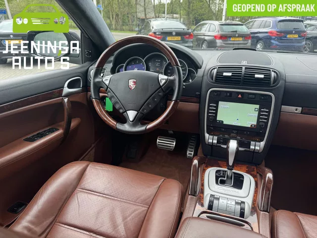 Porsche Cayenne 4.8 Turbo | Youngtimer. Algemene gegevens. Kenteken: R-581-DN. Tellerstand: 90189 KM. Carrosserievorm: SUV. Aantal deuren: 5. Brandstofsoort: Benzine. Bouwjaar: 2007. Transmissie: Automaat. Kleur: Zwart Metallic. Interieur: Bruin. Bekleding: Leder. Technische gegevens. Motorinhoud: 4806 cc. Aantal cilinders: 8. Vermogen: 368 kW / 501pk. Koppel: 700Nm. Ledig gewicht: 2380 kg. Max. trekgewicht: 3000 kg. Emissieklasse: Euro 4. Acceleratie (0-100 km/h): 5.1 seconden. Topsnelheid: 275 km/h. Gemiddeld verbruik (gecombineerd): 14.9 l/100km. Financiële gegevens. Motorrijtuigenbelasting: € 472 - 517 per kwartaal. BTW/Marge: Marge, de BTW is niet aftrekbaar. Comfort. Cruise control. Exterieur. 22 inch lichtmetalen velgen; Achterruitwisser; Bi-xenon koplampen; Buitenspiegel rechts; Buitenspiegels elektrisch verstelbaar; Centrale vergrendeling; Dimlichten automatisch; Elektrisch bedienbare achterklep; Elektrisch schuif-/kanteldak; Extra getint glas achter; Getint glas; Glazen...