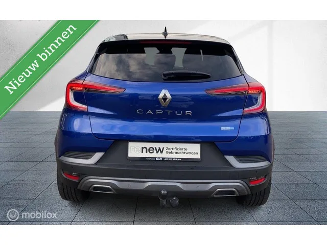 Renault Captur 1.6 E-Tech Plug-in Hybrid 160 RS Line. Merk: Renault; Model: Captur; Tellerstand: 83099 KM; Carrosserievorm: SUV; Aantal deuren: 5; Brandstofsoort: Hybride (Elektrisch/Benzine); Bouwjaar: 2021; Transmissie: Automaat; Kleur: blauw Metallic; Bekleding: Stof; Motorinhoud: 1598 cc; Aantal cilinders: 4; Vermogen: 68 kW / 93pk; Ledig gewicht: 1516 kg; Aantal zitplaatsen: 5; Verbruik: 1.3 l/100 km; BTW/Marge: Marge, de BTW is niet aftrekbaar; Aantal sleutels: 2; Onderhoudshistorie aanwezig: Ja. Pakket: Pack Drive Assist. Cruise control adaptief; Dodehoek detectie; File assistent; Stuur leder; Stuur verwarmd. Comfort. Boordcomputer; Cruise control; Regensensor. Exterieur. Achterspoiler; Andere dakkleur; Buitenspiegels elektrisch inklapbaar; Buitenspiegels elektrisch verstel- en verwarmbaar; Dakrails; Dimlichten automatisch; Extra getint glas achter; Keyless entry; LED achterlichten; LED dagrijverlichting; LED koplampen; Lichtmetalen velgen 18"; Metaalkleur; Parkeersensor...