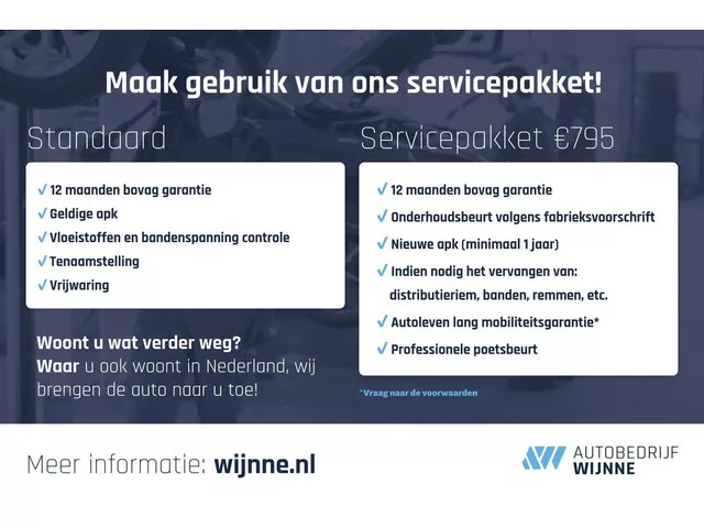 Wilt u langskomen voor een bezichtiging? Om uw komst te plannen en teleurstelling te voorkomen maken wij graag een afspraak met u. Contactpersonen: ? Gerrit Wijnne – 06-41012839. ? Paul Bosschaart – 06-19209234. Autobedrijf Wijnne is een allround BOVAG autobedrijf aangesloten bij Bosch Car Service. Wij zijn een echt familiebedrijf met een hecht team medewerkers die service hoog in het vaandel hebben staan. Onze klanten waarderen dat met een 9,2 op klanttevredenheid. In 2025 behaalden wij een finaleplek bij de verkiezing ‘BOVAG Onafhankelijk Autobedrijf van het Jaar’ – een mooie erkenning voor onze kwaliteit, service en klantgerichtheid. Al meer dan 45 jaar zijn wij het juiste adres voor de aanschaf van een betrouwbare gebruikte auto. Deze auto wordt standaard geleverd inclusief 12 maanden BOVAG garantie en een geldige APK. Tegen een meerprijs van 795 euro kunt u kiezen voor ons servicepakket waarbij de auto wordt afgeleverd met een onderhoudsbeurt volgens fabrieksvoorschriften,...