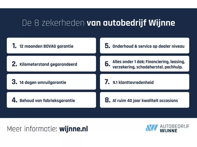 Wilt u langskomen voor een bezichtiging? Om uw komst te plannen en teleurstelling te voorkomen maken wij graag een afspraak met u. Contactpersonen: ? Gerrit Wijnne – 06-41012839. ? Paul Bosschaart – 06-19209234. Autobedrijf Wijnne is een allround BOVAG autobedrijf aangesloten bij Bosch Car Service. Wij zijn een echt familiebedrijf met een hecht team medewerkers die service hoog in het vaandel hebben staan. Onze klanten waarderen dat met een 9,2 op klanttevredenheid. In 2025 behaalden wij een finaleplek bij de verkiezing ‘BOVAG Onafhankelijk Autobedrijf van het Jaar’ – een mooie erkenning voor onze kwaliteit, service en klantgerichtheid. Al meer dan 45 jaar zijn wij het juiste adres voor de aanschaf van een betrouwbare gebruikte auto. Deze auto wordt standaard geleverd inclusief 12 maanden BOVAG garantie en een geldige APK. Tegen een meerprijs van 795 euro kunt u kiezen voor ons servicepakket waarbij de auto wordt afgeleverd met een onderhoudsbeurt volgens fabrieksvoorschriften,...