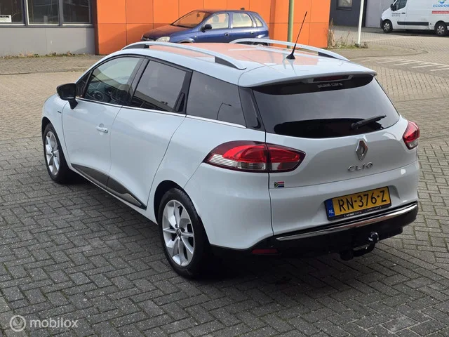 Renault Clio Estate 0.9 TCe Limited✅️Airco✅️Apk✅️. Kenteken: RN-376-Z; Merk: Renault; Model: Clio Estate; APK tot: 26-01-2027; Tellerstand: 64806 KM; Carrosserievorm: Station; Aantal deuren: 5; Brandstofsoort: Benzine; Bouwjaar: 2018; Transmissie: Handgeschakeld; Kleur: wit; Bekleding: Stof; Kleur interieur: grijs; Motorinhoud: 898 cc; Aantal cilinders: 3; Motorcode: H4B B4; Vermogen: 66 kW / 90pk; Ledig gewicht: 1063 kg; Max. trekgewicht: 1200 kg; Aantal zitplaatsen: 5; Verbruik: 4.6 l/100 km; BTW/Marge: Marge, de BTW is niet aftrekbaar; Lengte: 427 cm; Breedte: 173 cm; Aantal sleutels: 2; Onderhoudshistorie aanwezig: Dealer onderhouden; Motorrijtuigenbelasting: € 145 - 158 per kwartaal; Emissieklasse: Euro 6. Comfort. Boordcomputer; Cruise control. Exterieur. Achterruitwisser; Achterspoiler; Buitenspiegels elektrisch verstel- en verwarmbaar; Centrale vergrendeling met afstandsbediening; Chroom delen exterieur; Dakrails; Extra getint glas achter; LED dagrijverlichting; Lichtmetalen...