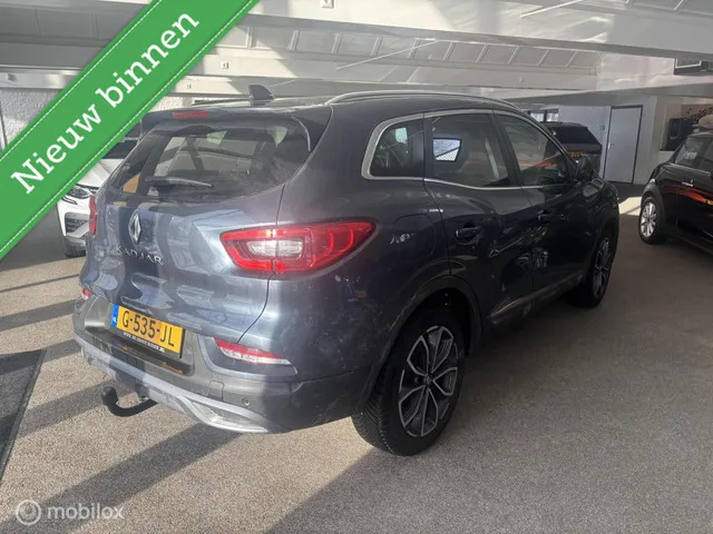 Renault Kadjar 1.3 TCe Intens. Kenteken: G-535-JL; Merk: Renault; Model: Kadjar; APK tot: 10-10-2027; Tellerstand: 154242 KM; Carrosserievorm: SUV; Aantal deuren: 5; Brandstofsoort: Benzine; Bouwjaar: 2019; Transmissie: Automaat; Kleur: grijs Metallic; Bekleding: Leder/Stof; Kleur interieur: zwart; Motorinhoud: 1330 cc; Aantal cilinders: 4; Motorcode: H5H B4; Vermogen: 117 kW / 159pk; Ledig gewicht: 1337 kg; Max. trekgewicht: 1500 kg; Aantal zitplaatsen: 5; Verbruik: 5.9 l/100 km; BTW/Marge: Marge, de BTW is niet aftrekbaar; Lengte: 445 cm; Breedte: 184 cm; Aantal sleutels: 2; Onderhoudshistorie aanwezig: Ja; Motorrijtuigenbelasting: € 192 - 211 per kwartaal; Emissieklasse: Euro 6. Pakket: Easy Life Pack. Dodehoek detectie; Parkeer assistent. Comfort. Boordcomputer; Cruise control; Regensensor. Exterieur. Achterspoiler; Buitenspiegels elektrisch inklapbaar; Buitenspiegels elektrisch verstelbaar; Buitenspiegels in carrosseriekleur; Buitenspiegels met verlichting; Buitenspiegels...