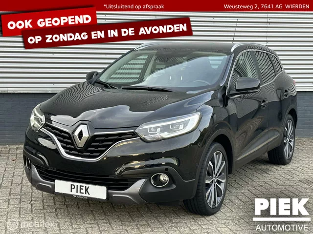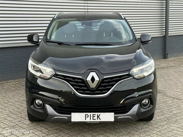 Renault Kadjar 1.2 TCe Intens PANORAMADAK, AUTOMAAT. Merk: Renault; Model: Kadjar; APK tot: 31-12-2025; Tellerstand: 55860 KM; Carrosserievorm: SUV; Aantal deuren: 5; Brandstofsoort: Benzine; Bouwjaar: 2017; Transmissie: Automaat; Kleur: zwart; Motorinhoud: 1198 cc; Aantal cilinders: 4; Vermogen: 96 kW / 131pk; Ledig gewicht: 1295 kg; Aantal zitplaatsen: 5; Verbruik: 5.5 l/100 km; BTW/Marge: Marge, de BTW is niet aftrekbaar; Aantal sleutels: 2. Pakket: Easy Life Pack. Achteruitrijcamera; Dodehoek detectie; Parkeer assistent. Pakket: Pack Easy. Achteruitrijcamera; Dodehoek detectie; Parkeer assistent; Parkeersensor voor en achter. Pakket: Pack Lumière. Binnenspiegel automatisch dimmend; Buitenspiegel(s) automatisch dimmend; Panoramadak. Pakket: Pack Luxe. Elektrisch verstelbare bestuurdersstoel; Stuur leder. Pakket: Pack Safety. Autonomous Emergency Braking; Dodehoek detectie; Parkeersensor voor. Pakket: Pack Tech. Achteruitrijcamera; Autonomous Emergency Braking; Dodehoek detectie...