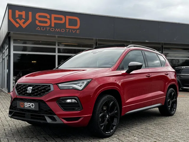 Seat Ateca 1.5 TSI FR Business Intense|Pano|Beats|ACC|360|. Kenteken: L-179-ZR; Merk: Seat; Model: Ateca; APK tot: 17-09-2027; Tellerstand: 139377 KM; Carrosserievorm: SUV; Aantal deuren: 5; Brandstofsoort: Benzine; Bouwjaar: 2021; Transmissie: Automaat; Kleur: rood Metallic; Bekleding: Leder; Kleur interieur: zwart; Motorinhoud: 1498 cc; Aantal cilinders: 4; Motorcode: DPC; Vermogen: 110 kW / 150pk; Ledig gewicht: 1308 kg; Max. trekgewicht: 1600 kg; Aantal zitplaatsen: 5; Verbruik: 5.6 l/100 km; BTW/Marge: BTW aftrekbaar, de prijs is inclusief BTW; Lengte: 438 cm; Breedte: 184 cm; Hoogte: 1615 cm; Aantal sleutels: 2; Onderhoudshistorie aanwezig: Ja; Motorrijtuigenbelasting: € 199 - 217 per kwartaal; Emissieklasse: Euro 6. Pakket: Adaptive Cruise Control. Cruise control adaptief; Grootlichtassistent; Vervolgbotsing preventie. Pakket: Driver Assistance Pack L. Achteruitrij assistent; Bots herkenning en activatie; Cruise control adaptief; Dodehoek detectie; Grootlichtassistent...