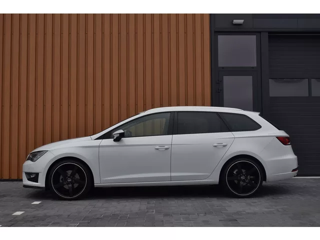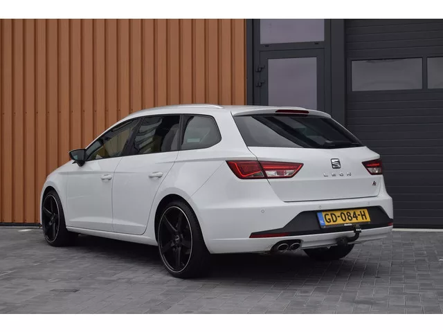 SEAT Leon ST 1.4 TSI 150pk FR Dynamic. Uitgevoerd met o.a.: Climate control, Cruise control, Navigatiesysteem, Seat soundsysteem, Half lederen interieur met sportstoelen voor, Multifunctioneel lederen stuurwiel, Aluminium pedalen, LED koplampen en achterlichten, Buitenspiegels elektrisch verwarm- en inklapbaar, Lichtmetalen velgen 19", Seat Drive Profile, Parkeersensoren voor en achter, Licht en Zicht pakket, Trekhaak. Keurige en goed onderhouden Seat Leon FR met volledige onderhoudshistorie aanwezig. Laatste onderhoudsbeurt recent uitgevoerd bij 159.745km. 6 versn., Handgeschakeld; Modeljaar: 2014; 110 kW; 250 Nm; 4 cilinders; 1.395cc; Gewicht: 1.177kg; Laadvermogen: 653kg; GVW: 1.830kg; Max. trekgewicht: 1.500kg; LxBxH: 454x182x145cm; Wielbasis: 264cm; 50l tank; 0-100 km/h: 8,1s; Topsnelheid: 215km/u; Interieur: zwart, Leder/stof; 5 zitplaatsen; 4,7 l/100km; 5,8 l/100km; 4,2 l/100km; 109 g/km CO₂; Energielabel A; Euro 6; Onderhoudsboekjes aanwezig; Aantal eigenaren: 3; APK: tot...