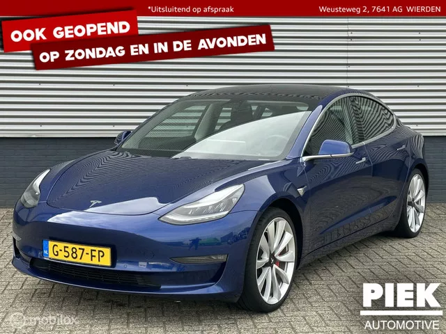 Tesla Model 3 Performance 4WD AUTOPILOT FULL SELF DRIVING. Kenteken: G-587-FP; Merk: Tesla; Model: Model 3; APK tot: 31-07-2026; Tellerstand: 90957 KM; Carrosserievorm: Hatchback; Aantal deuren: 5; Brandstofsoort: Elektrisch; Bouwjaar: 2019; Transmissie: Automaat; Kleur: blauw; Motorcode: 3D3; Vermogen: 339 kW / 462pk; Ledig gewicht: 1831 kg; Aantal zitplaatsen: 5; BTW/Marge: BTW aftrekbaar, de prijs is inclusief BTW; Lengte: 469 cm; Breedte: 185 cm; Hoogte: 1443 cm; Aantal sleutels: 2; Onderhoudshistorie aanwezig: Ja; Emissieklasse: Euro Z. Pakket: Basic Autopilot. Cruise control adaptief met Stop&Go en stuurhulp. Pakket: Full Self Driving Capability. Autonome parkeerfunctie; Autopilot; Zelfstandige rijstrookwissel. Comfort. Regensensor. Exterieur. Achterruitwisser; Achterspoiler; Buitenspiegel(s) automatisch dimmend; Buitenspiegels elektr. met geheugen; Buitenspiegels elektrisch inklapbaar; Buitenspiegels elektrisch verstelbaar; Buitenspiegels verwarmbaar; Getint glas; Keyless...