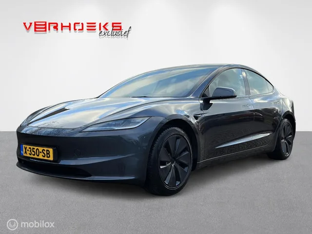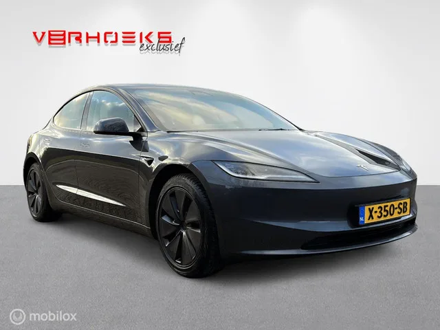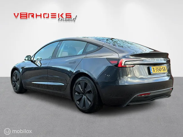 Tesla Model 3 RWD NIEUW MODEL!! BTW. Kenteken: X-350-SB; Merk: Tesla; Model: Model 3; APK tot: 23-01-2028; Tellerstand: 49657 KM; Carrosserievorm: Hatchback; Aantal deuren: 5; Brandstofsoort: Elektrisch; Geschikt voor snelladen: Ja; Bouwjaar: 2024; Transmissie: Automaat; Kleur: grijs Metallic; Kleurnaam: Stealth Grey metallic; Bekleding: Leder; Kleur interieur: zwart; Motorcode: 3D7; Vermogen: 208 kW / 283pk; Ledig gewicht: 1736 kg; Max. trekgewicht: 1000 kg; Aantal zitplaatsen: 5; BTW/Marge: BTW aftrekbaar, de prijs is inclusief BTW; Lengte: 472 cm; Breedte: 185 cm; Hoogte: 1441 cm; Aantal sleutels: 2; Onderhoudshistorie aanwezig: Dealer onderhouden; Motorrijtuigenbelasting: € 73 - 81 per kwartaal; Emissieklasse: Euro Z. Comfort. Regensensor. Exterieur. 18" Aluminium velgen; Achteruitrijcamera; Autopilot; Buitenspiegel rechts; Buitenspiegel(s) automatisch dimmend; Buitenspiegels elektrisch inklapbaar; Buitenspiegels elektrisch verstelbaar; Buitenspiegels verwarmbaar; CCS laden...