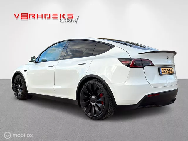 Tesla Model Y Performance AWD 75 kWh. Kenteken: JGX-58-N; Merk: Tesla; Model: Model Y; APK tot: 12-12-2026; Tellerstand: 95230 KM; Carrosserievorm: SUV; Aantal deuren: 5; Brandstofsoort: Elektrisch; Geschikt voor snelladen: Ja; Bouwjaar: 2022; Transmissie: Automaat; Kleur: wit Metallic; Kleurnaam: Pearl White metallic; Bekleding: Leder; Kleur interieur: zwart; Motorcode: 3D3; Vermogen: 413 kW / 563pk; Ledig gewicht: 1972 kg; Max. trekgewicht: 1600 kg; Aantal zitplaatsen: 5; BTW/Marge: BTW aftrekbaar, de prijs is inclusief BTW; Lengte: 475 cm; Breedte: 192 cm; Hoogte: 1624 cm; Aantal sleutels: 2; Onderhoudshistorie aanwezig: Dealer onderhouden; Motorrijtuigenbelasting: € 93 - 103 per kwartaal; Emissieklasse: Euro Z. Pakket: Basic Autopilot. Cruise control adaptief met Stop&Go; Kleur zwart. Comfort. Regensensor. Exterieur. Achterspoiler; Achteruitrijcamera; All Wheel Drive Performance; Autopilot; Buitenspiegel rechts; Buitenspiegel(s) automatisch dimmend; Buitenspiegels elektr. met...