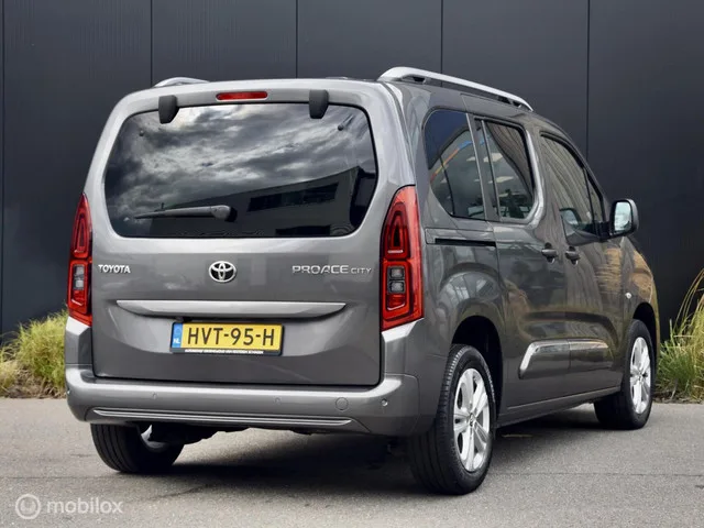 Toyota PROACE CITY Verso 110pk Active |10 jaar Garantie|. Kenteken: HVT-95-H; Merk: Toyota; Model: PROACE CITY Verso; Tellerstand: 73501 KM; Carrosserievorm: MPV; Aantal deuren: 5; Brandstofsoort: Benzine; Bouwjaar: 2020; Transmissie: Handgeschakeld; Kleur: grijs Metallic; Bekleding: Stof; Kleur interieur: antraciet; Motorinhoud: 1199 cc; Aantal cilinders: 3; Motorcode: HN05; Vermogen: 81 kW / 110pk; Ledig gewicht: 1341 kg; Max. trekgewicht: 1150 kg; Aantal zitplaatsen: 5; BTW/Marge: Marge, de BTW is niet aftrekbaar; Lengte: 440 cm; Breedte: 185 cm; Aantal sleutels: 2; Onderhoudshistorie aanwezig: Dealer onderhouden; Motorrijtuigenbelasting: € 199 - 217 per kwartaal; Fabrieksgarantie tot: 24-11-2030; Aantal maanden fabrieksgarantie: 120; Emissieklasse: Euro 6. Comfort. Boordcomputer; Cruise control; Regensensor. Exterieur. Achterklep met ruit; Achterruit apart te openen; Achterruitverwarming; Achterruitwisser; Achterruitwisser en sproeier; Buitenspiegel rechts; Buitenspiegels...
