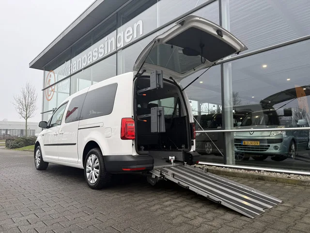 Nieuw binnen: deze zeer nette en compleet uitgevoerde Volkswagen Caddy Maxi 7+0 of 5+1 Rolstoelauto 1.4 TSI Comfortline Automaat uit 2018 met nog maar 88 dkm. op de teller welke is voorzien van heel veel fijne opties waaronder extra getint glas, regensensor, parkeersensoren, 2 schuifdeuren, cruise control, airconditioning, full-map kleurennavigatie, audio-installatie, telefoonvoorbereiding, armsteun, elektrische ramen en buitenspiegels, etc... Daarnaast beschikt deze mooie ruime Caddy Maxi over een ruime bodemverlaging met een lichtgewicht opklapbare oprijplaat en een 4-punts rolstoel-fixeersysteem waardoor veilig en comfortabel vervoer van werkelijk ieder type rolstoel of scootmobiel mogelijk is. Ook is er een wegklapbare hoofd- en rugsteun voor de rolstoelpassagier aanwezig welke op verzoek gemonteerd zou kunnen worden en door de aanwezigheid van de extra 2-zits bank op de 3e zitrij kan de auto in een handomdraai worden ingezet als volwaardige 7-zitter wanneer er geen rolstoel...