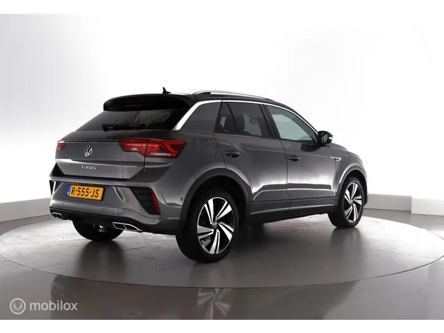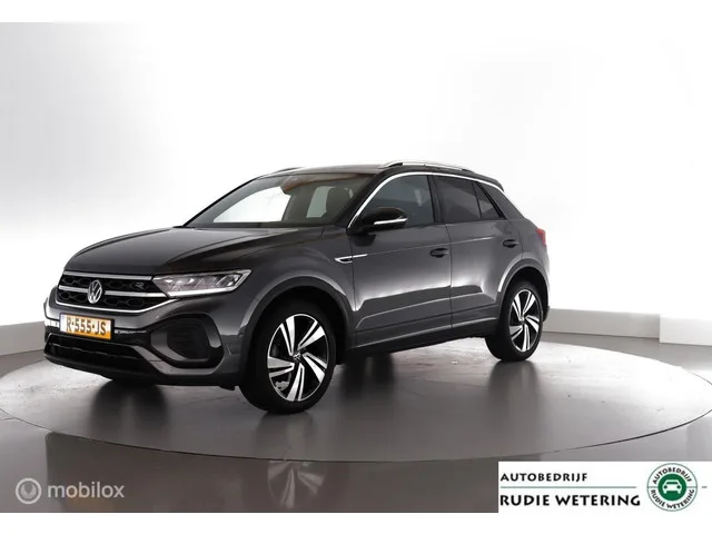 Volkswagen T-Roc 1.5 TSI Automaat R-Line Facelift|led|nav|blis|acc|lmv18. Kenteken: R-555-JS; Merk: Volkswagen; Model: T-Roc; APK tot: 20-09-2026; Tellerstand: 76586 KM; Carrosserievorm: SUV; Aantal deuren: 5; Brandstofsoort: Benzine; Bouwjaar: 2022; Transmissie: Automaat 7-Traps; Kleur: grijs Metallic; Kleurnaam: Twotone Indium Grey Metallic Kleurcode: LR7H met Zwart Dak; Bekleding: Leder/Alcantara; Kleur interieur: zwart; Motorinhoud: 1498 cc; Aantal cilinders: 4; Motorcode: DPC; Vermogen: 110 kW / 150pk; Ledig gewicht: 1253 kg; Max. trekgewicht: 1500 kg; Aantal zitplaatsen: 5; Verbruik: 5.6 l/100 km; BTW/Marge: BTW aftrekbaar, de prijs is inclusief BTW; Lengte: 424 cm; Breedte: 182 cm; Aantal sleutels: 2; Onderhoudshistorie aanwezig: Ja; Motorrijtuigenbelasting: € 199 - 217 per kwartaal; Emissieklasse: Euro 6; Bandenmaat voor: 215/50/18; Bandemaat achter: 215/50/18; Wielbasis: 2666 mm. Pakket: Assistance pakket Plus. Cruise control adaptief en stuurhulp; Dodehoek detectie; File...