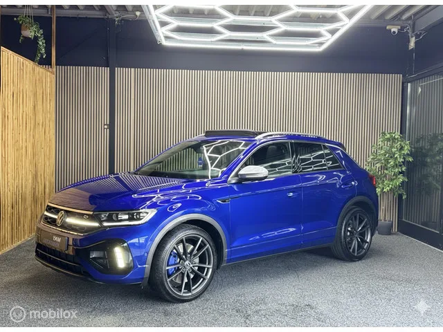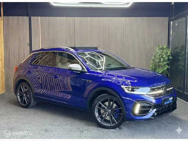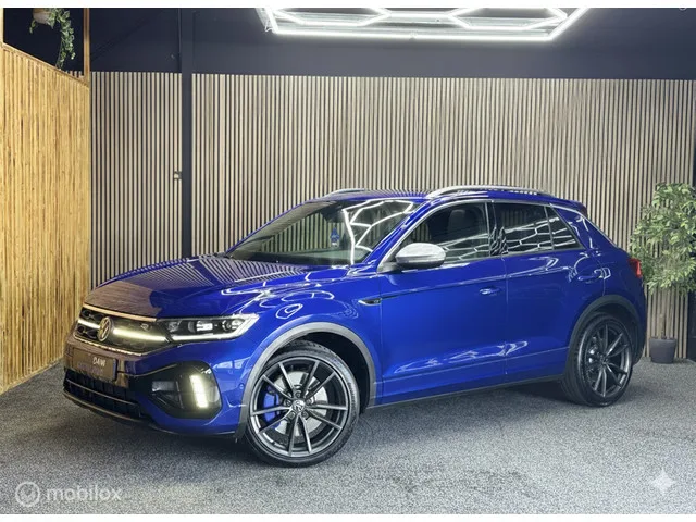 Volkswagen T-Roc 2.0 TSI 4Motion R 400|Pano|Acc|Camera|Akra. Merk: Volkswagen; Model: T-Roc; APK tot: 08-08-2026; Tellerstand: 77128 KM; Carrosserievorm: SUV; Aantal deuren: 5; Brandstofsoort: Benzine; Bouwjaar: 2022; Transmissie: Automaat; Kleur: blauw; Bekleding: Leder/Stof; Kleur interieur: zwart; Interieurnaam: Zwart blauw; Motorinhoud: 1984 cc; Aantal cilinders: 4; Motorcode: DNF; Vermogen: 221 kW / 301pk; Ledig gewicht: 1468 kg; Max. trekgewicht: 1700 kg; Aantal zitplaatsen: 5; Verbruik: 8.4 l/100 km; BTW/Marge: Marge, de BTW is niet aftrekbaar; Lengte: 424 cm; Breedte: 182 cm; Aantal sleutels: 2; Onderhoudshistorie aanwezig: Ja; Motorrijtuigenbelasting: € 253 - 276 per kwartaal; Emissieklasse: Euro 6. Comfort. Boordcomputer; Regensensor. Exterieur. Buitenspiegel(s) automatisch dimmend; Buitenspiegels elektrisch inklapbaar; Buitenspiegels elektrisch verstel- en verwarmbaar; Buitenspiegels met verlichting; Centrale vergrendeling met afstandsbediening; Chroom delen exterieur...