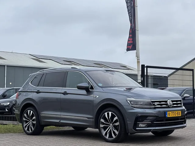 Volkswagen Tiguan Allspace 1.5 TSI Highline Business R 7p. Kenteken: K-770-BX; Merk: Volkswagen; Model: Tiguan Allspace; APK tot: 24-11-2026; Tellerstand: 118920 KM; Carrosserievorm: SUV; Aantal deuren: 5; Brandstofsoort: Benzine; Bouwjaar: 2020; Transmissie: Automaat; Kleur: grijs; Motorinhoud: 1495 cc; Aantal cilinders: 4; Motorcode: DPC; Vermogen: 110 kW / 150pk; Ledig gewicht: 1550 kg; Max. trekgewicht: 1800 kg; Aantal zitplaatsen: 7; Verbruik: 6.1 l/100 km; BTW/Marge: BTW aftrekbaar, de prijs is inclusief BTW; Lengte: 471 cm; Breedte: 186 cm; Aantal sleutels: 2; Onderhoudshistorie aanwezig: Ja; Motorrijtuigenbelasting: € 253 - 276 per kwartaal; Emissieklasse: Euro 6. Bijzondere opties & accessoires. Dodehoek detectie; Elektrisch glazen panorama-dak; Elektrisch verstelbare stoel(en) met geheugen; Keyless start; Panoramadak; R-Line exterieur; Trekhaak elektrisch uitklapbaar; Voorstoel(en) met massagefunctie; Voorstoelen verwarmd; Voorstoelen verwarmd en elektrische lendesteunen. ...