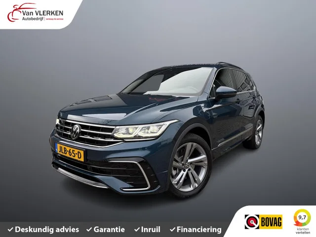 Volkswagen Tiguan 1.4 TSI eHybrid R-Line PANORAMADAK. Algemene gegevens. Kenteken: JLB-65-D. Tellerstand: 21120 KM. Carrosserievorm: SUV. Aantal deuren: 5. Brandstofsoort: Hybride (Elektrisch/Benzine). Bouwjaar: 2023. Transmissie: Automaat. Kleur: Blauw Metallic. Interieur: Zwart. Bekleding: Leder/Stof. Onderhoudshistorie aanwezig: Dealer onderhouden. Aantal maanden fabrieksgarantie: 24. Technische gegevens. Motorinhoud: 1395 cc. Aantal cilinders: 4. Vermogen: 180 kW / 245pk. Koppel: 400Nm. Ledig gewicht: 1701 kg. Max. trekgewicht: 1800 kg. Emissieklasse: Euro Z. Acceleratie (0-100 km/h): 7.5 seconden. Topsnelheid: 205 km/h. Gemiddeld verbruik (gecombineerd): 1.5 l/100km. Functionaliteit. Lengte (cm): 451 cm. Breedte (cm): 186 cm. Financiële gegevens. Motorrijtuigenbelasting: € 228 per kwartaal. Oorspronkelijke cataloguswaarde: € 53039 (incl. 21% BTW, incl. BPM). BTW/Marge: Marge, de BTW is niet aftrekbaar. Pakket: Assistentie Pakket. Bots herkenning en activatie; Cruise control...