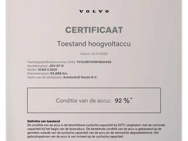 Transmissie: 8 versnellingen, Automaat; Modeljaar: 2020; Vierwielaandrijving; Vermogen brandstofmotor: 186 kW (253 PK); Koppel: 350 Nm; Aantal cilinders: 4; Motorinhoud: 1.969 cc; Ledig gewicht: 2.069 kg; Wielbasis: 287 cm; Tankinhoud: 70 liter; Acceleratie (0-100): 5,9 s; Topsnelheid: 180 km/u; Interieurkleur: zwart; 5 zitplaatsen; Gemiddeld brandstofverbruik: 2,4 l/100km (1 op 41,7); Energielabel: A; Dealer onderhouden (onderhoudsboekjes aanwezig); Nieuwe APK bij aflevering; Garantielabel: BOVAG Garantie (12 maanden); Motorrijtuigenbelasting: € 414 - € 453 per kwartaal; vanaf € 520 p/m (financial lease, 72 maanden); informeer naar de mogelijkheden en voorwaarden; Optioneel afleverpakket: ㅤSELEKT Garantie Volvo? Onderstaande 2 Selecteren: (zonder meerprijs); Referentienummer: JDV-27-D